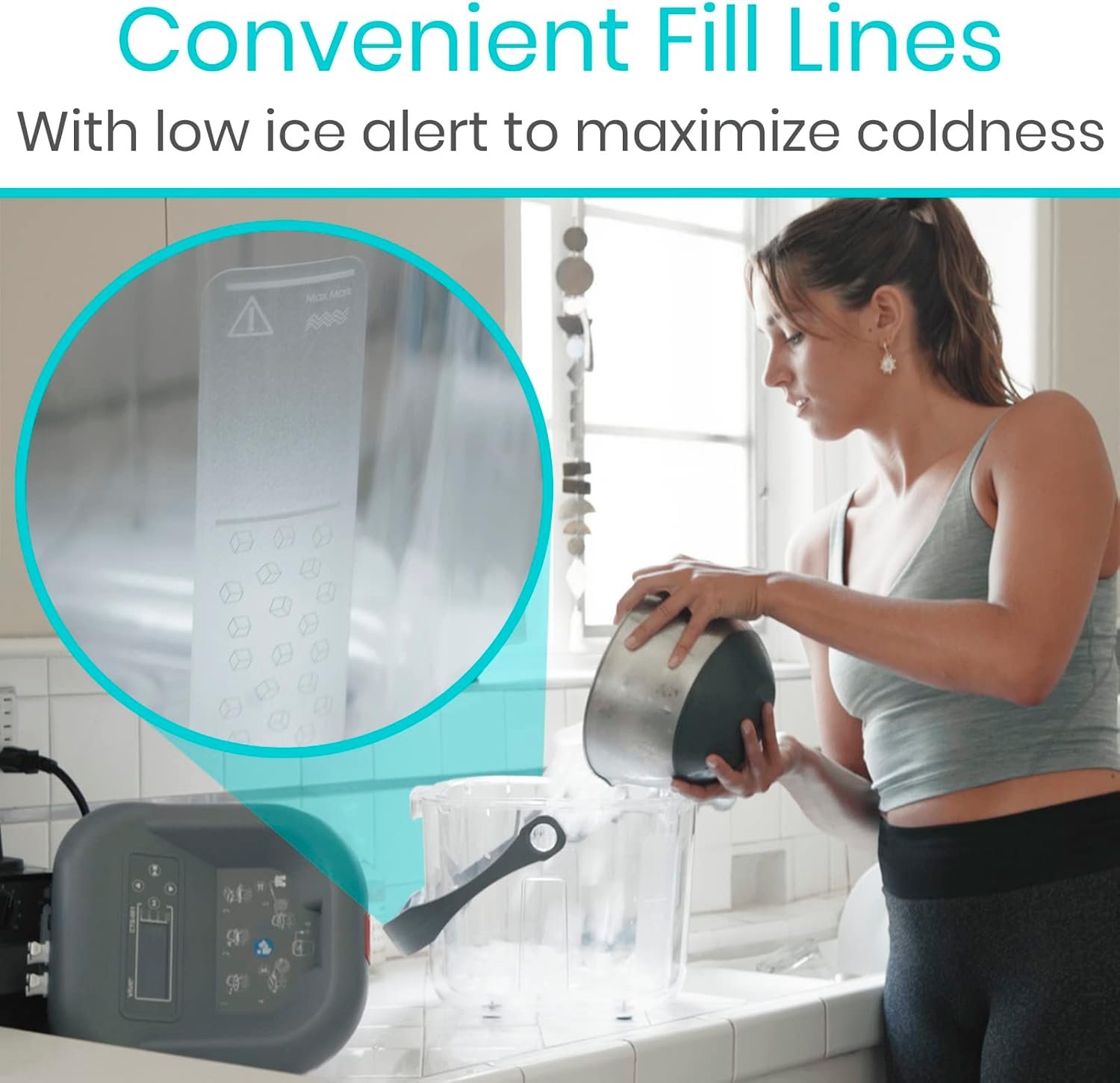 Engineered for convenience, this cooling therapy system operates quietly, is compact, and features an integrated carry handle for easy transport. The transparent base facilitates straightforward filling, complete with marked indicators for both ice and water levels.