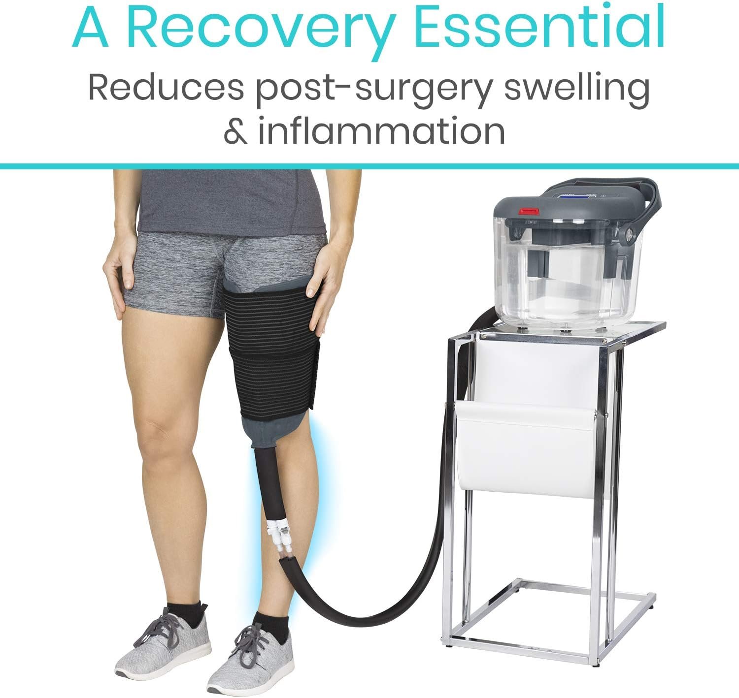 Experience cool and soothing relief for post-surgery swelling, inflammation, joint pain, and post-workout recovery with Tibue’s ice therapy machine. This innovative device includes a robust base unit, a universal cold therapy pad, extended reach insulated tubing, and three secure straps. Capable of holding six liters of ice water, the therapy machine offers five continuous flow rates and cycle times of 30 minutes or less, providing a tailored experience for users.